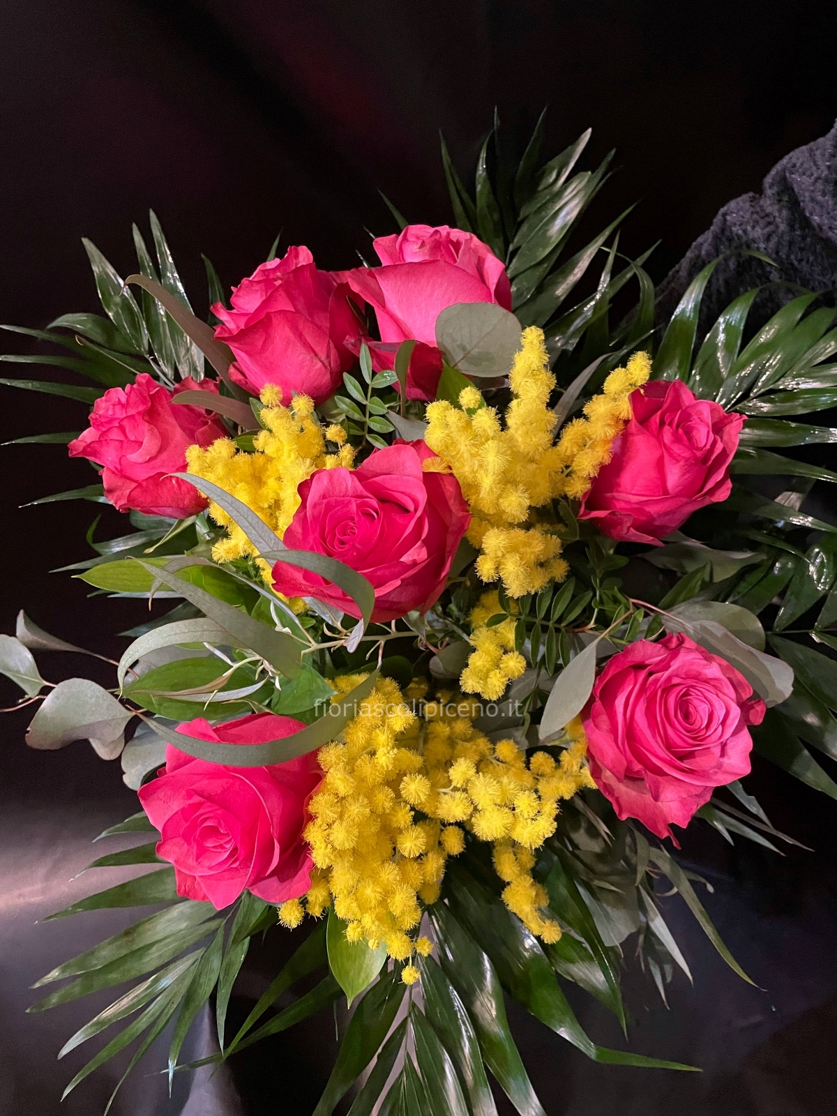 | Bouquet di rose colorate con mimosa Cod. 125909 |